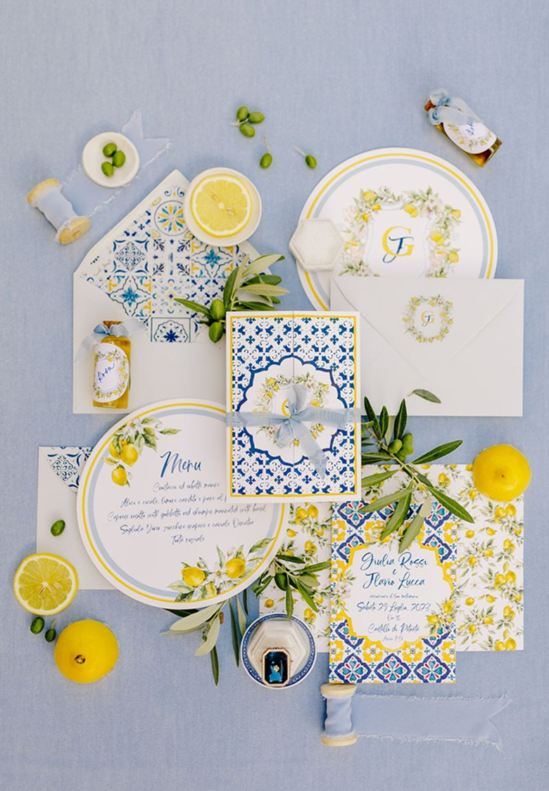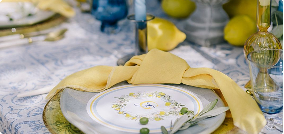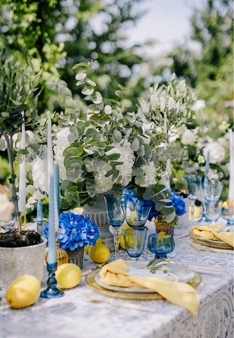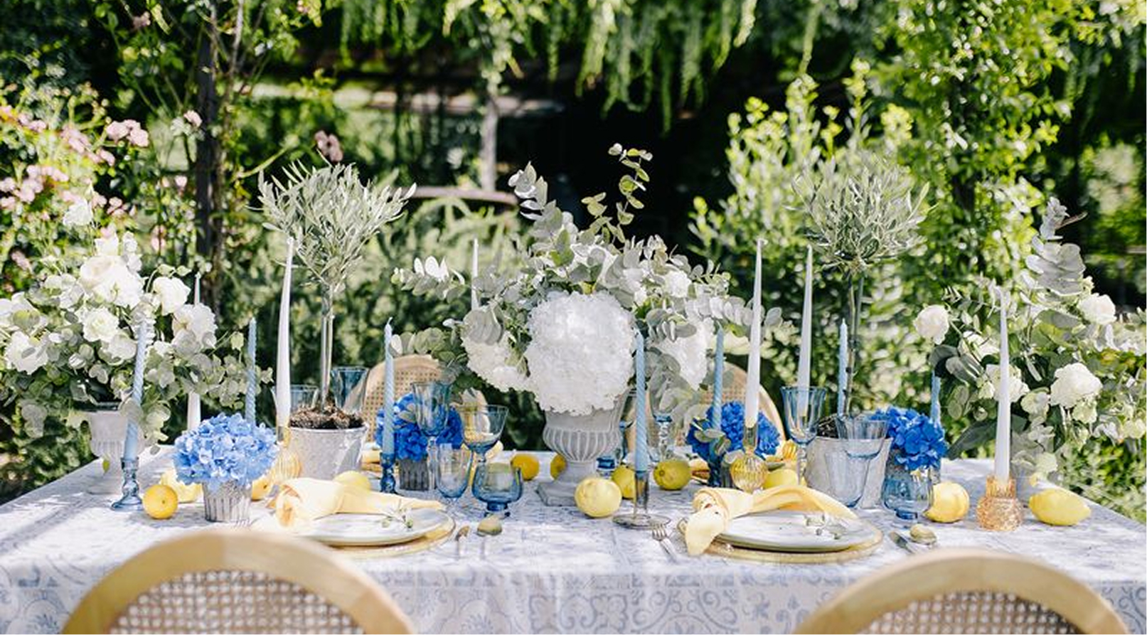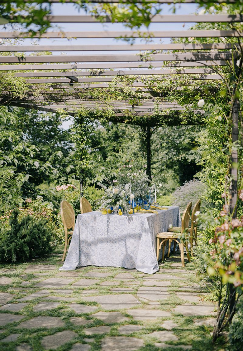 Večeře byla zasazené pod pergolou porostlou vinnou révou, v paletě jemné žluté a středomořské modré.